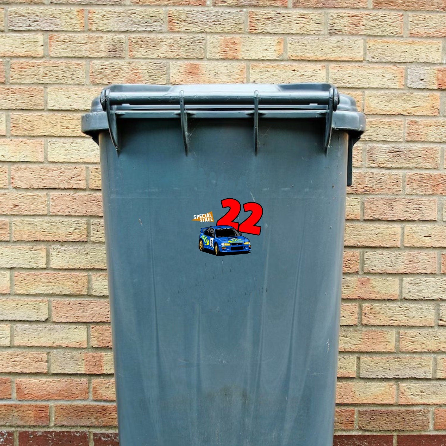 Set of 4 House Number Bin Stickers A5 - Personalised with Special Stage Subaru WRC design.